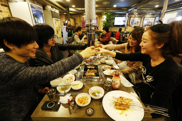중국인 유학생 뚜메이씨(맨 오른쪽)와 친구들이 서울 광진구 자양동 ‘경성양꼬치’에서 건배를 하고 있다.