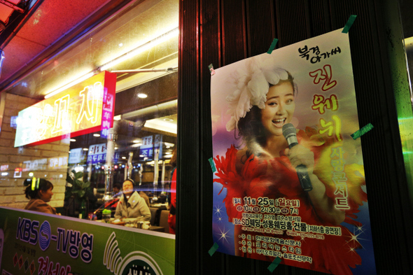 ‘경성양꼬치’ 외부 기둥에 중국인 가수의 공연을 알리는 포스터가 붙어있다.