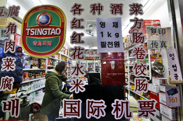중국 동포 이군철(38)씨가 운영하는 ‘태평양중국식품’의 유리창에 중국어가 가득 쓰여 있다.