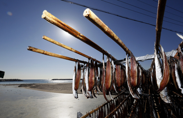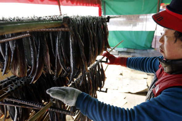 경북 포항 구룡포의 인근 해변에서 해풍에 과메기를 말리고 있다.