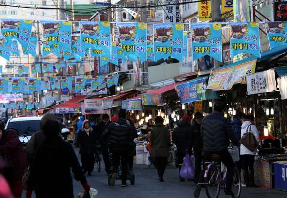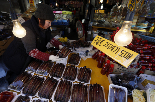 건어물상가에서 과메기의 껍질을 벗겨 먹기 좋게 손질한 뒤 정돈하고 있다.
