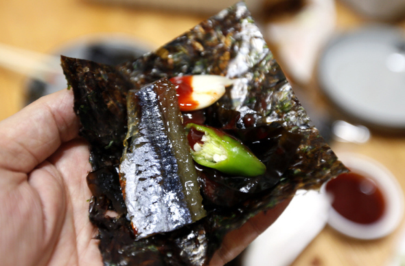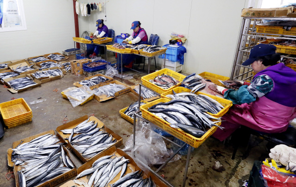 한때 추운 바다를 힘차게 누볐을 꽁치들이 덕장에 나와 꾸덕꾸덕 말라간다. 경북 포항 구룡포의 앞바다에 부는 북서풍에 얼었다 녹았다를 되풀이하기를 2~3일, 다시 내장이 육질에 스며드는 숙성 기간을 거쳐 비로소 겨울 별미 과메기가 된다. 과메기는 ‘눈에 실을 꿰어 말렸다’ 하는 관목어(貫目魚)에서 유래했는데, 목(目)이 이곳에선 ‘메기’나 ‘미기’로 불려서 ‘관메기’가 됐다가 다시 과메기로 변천됐다. 예전엔 청어로 만들었지만 청어 수확이 줄어 꽁치로 대체되었다. 하지만 오히려 비린 맛이 줄고 말리는 데 드는 시간도 줄어들었다고 한다. 누구는 비리다, 누구는 안 비리다 의견이 분분하지만 제대로 마른 과메기는 비리지 않고 쫀득하고 고소한 맛을 낸다. 그래서 차고 건조한 겨울바람이 과메기 최적의 맛을 좌우한다. 영일만 일대의 지형은 그 맛을 내기에 가장 적합하단다. 이곳에서 전국 과메기의 90%가 생산되는 이유다. 작업장에 앉아 뼈를 발라내는 어민들의 손길이 분주하다. 과메기 작업은 11월부터 2월까지 이뤄지는데 이때 벌어들이는 소득이 쏠쏠하긴 해도 메뚜기도 한철이다. 매서운 바람이 차가운지도, 한겨울 해가 짧은지도 모르게 과메기 덕장의 하루가 바쁘게 지나간다.