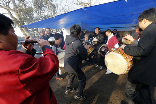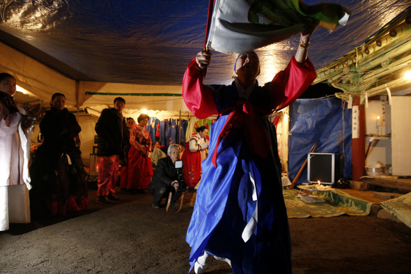 지난 2월16일 오후 충남 태안군 안면읍 황도리에서 마을 주민들과 무당들이 ‘황도붕기풍어제’에 사용될 제물들과 오색기를 들고서 해변가를 돌며 가정의 안녕을 기원하는 세경굿을 하고 있다.