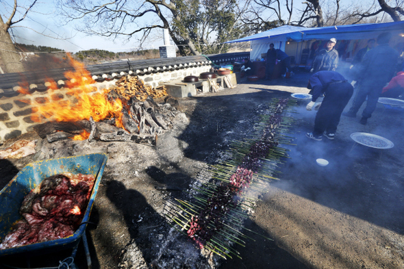 아침 일찍 마을 입구에 들어서자 비릿한 냄새가 코를 자극한다. 냄새가 나는 곳을 찾아가니 마을의 당집이 위치한 곳이다. 마을 남정네들이 새벽에 갓 잡은 소를 해체하는 작업을 하고 있다. 비릿한 냄새는 해체한 소에서 나온 피 냄새였다. 쇠고기를 꼬치에 꿰어 숯불에 굽고, 솥단지에서는 갈비탕이 끓고 있었다. 충남 태안 안면도 옆에 붙어 있는 작은 섬 황도에서는 아침부터 풍어제 준비로 분주했다.