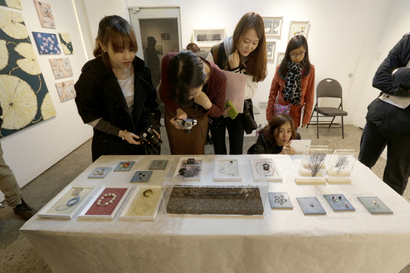 탐방객들이 문래창작촌 갤러리 두들에서 전시된 작품을 살펴보고 있다.