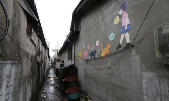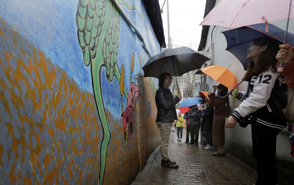 탐방객들이 문래동 58번지 골목 곳곳에 그려지거나 설치된 예술작품을 구경하고 있다.