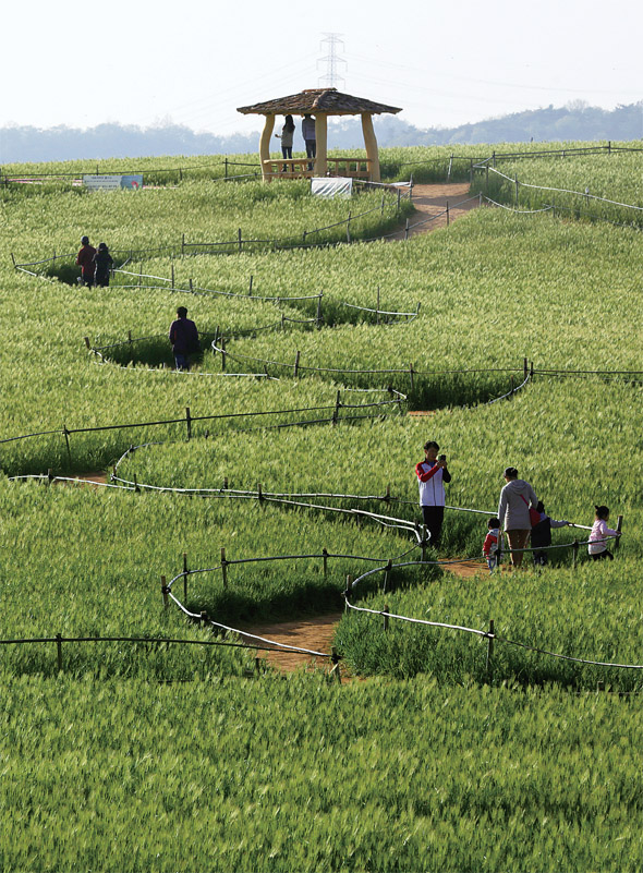 관광객들이 푸른 보리밭 사이로 난 길을 걸으며 봄을 만끽하고 있다.