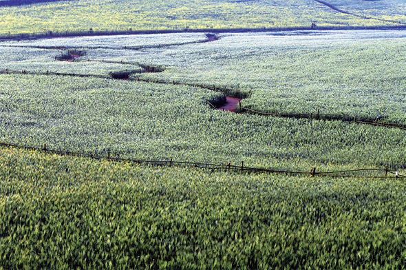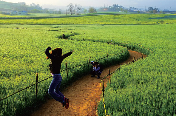 전북 고창군 공음면 선동리 드넓은 벌판에 펼쳐진 초록의 바다로 아스라한 봄볕이 잘게 부서져내린다. 긴 겨울을 서둘러 보낸 남녘의 벌판이 온통 초록의 잔치다. 보릿고개라는 옛말이 이제는 기억 저 너머로 사라지고 봄보리가 건강식품으로 자리매김하면서 쌀보다 더 귀하게 대접받는 시대가 되었다. 이와 더불어 보리밭 경관도 도시 생활에 지친 현대인들에게 힐링의 장소로 떠오르고 있다. 푸름으로 가득한 보리밭은 가족여행지로, 연인들의 데이트 코스로, 사진애호가들에겐 촬영 명소로 인기가 높다. 봄날이 가기 전에 이삭이 패기 시작한 보리밭 사잇길을 걸으며 봄바람을 맞는 것도 봄을 만끽하는 즐거움 중 하나다. 고창 보리나라 학원농장에서.