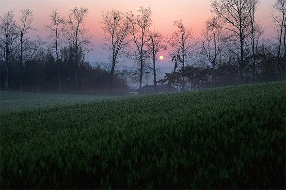 이른 아침 푸른 보리밭 위로 피어난 안개 속에서 태양이 떠오르고 있다.
