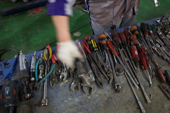 낯선 곳에서 원활한 작업을 하기 위해 공구를 정리하고 있다. “작업은 공구가 한다”고 말할 정도로 필요한 공구를 쉽게 찾아 쓸 수 있도록 정돈하는 일은 중요하다.