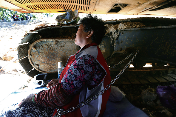 5월21일 오후 경남 밀양시 단장면 바드리마을 89번 송전탑 건설현장에서 한 할머니가 굴착기와 몸을 쇠사슬로 연결해 공사를 막고 있다.