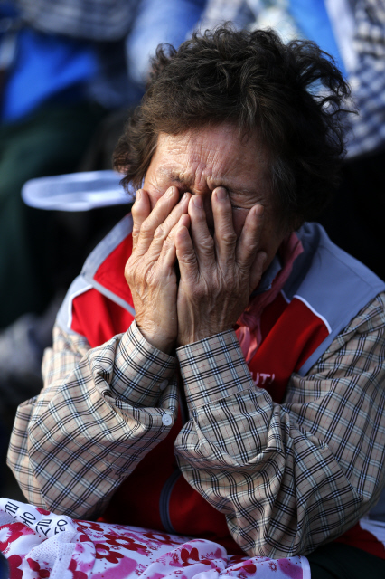 5월21일 오후 경남 밀양시 부북면 위양리 평밭마을 들머리 노숙농성장을 방문한 민주당 국회의원들 앞에서 주민들의 발언이 이어지자 한 할머니가 눈물을 흘리고 있다.