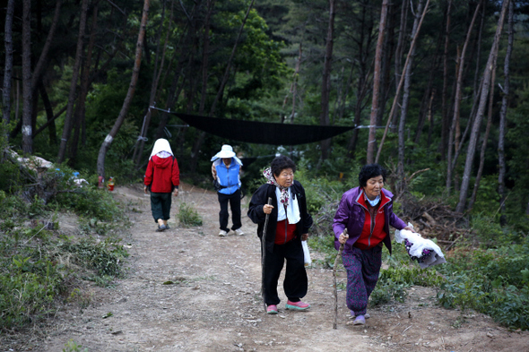 평밭마을 할머니들이 5월22일 새벽 127번 송전탑 공사현장을 오르고 있다.