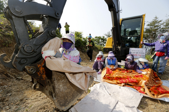 초고압 송전탑 건설에 반대하는 할머니가 지난 5월22일 오전 경남 밀양시 부북면 위양리 127번 송전탑 공사현장에 한국전력 직원들과 경찰이 나타나자 굴착기의 삽에 올라가 공사를 막고 있다.