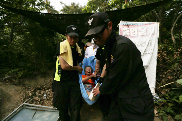 한국전력 직원들과의 충돌로 실시한 한 할머니가 5월22일 오후 127번 송전탑 공사장에서 후송되고 있다.
