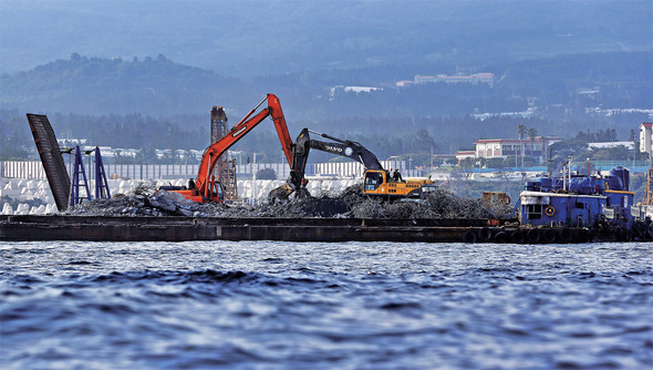바지선 위에 지난해 8월 태풍 ‘볼라벤’으로 파괴된 케이슨에서 해체된 콘트리트와 철근이 쌓여 있다.※ 이미지를 클릭하시면 좀더 큰 이미지를 보실 수 있습니다.