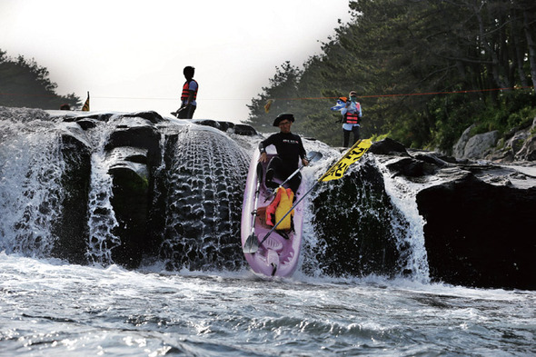 박도현 수사가 강정천과 바다의 경계인 멧부리를 카약을 타고 내려오고 있다.※ 이미지를 클릭하시면 좀더 큰 이미지를 보실 수 있습니다.