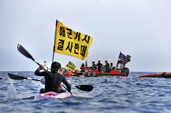 제주 강정마을 앞바다에서 해상시위 계속하는 SOS 평화활동가들… 구럼비 깨져나간 해안가엔 낯선 콘크리트 구조물이 시야를 가리고