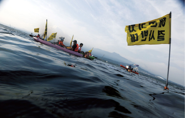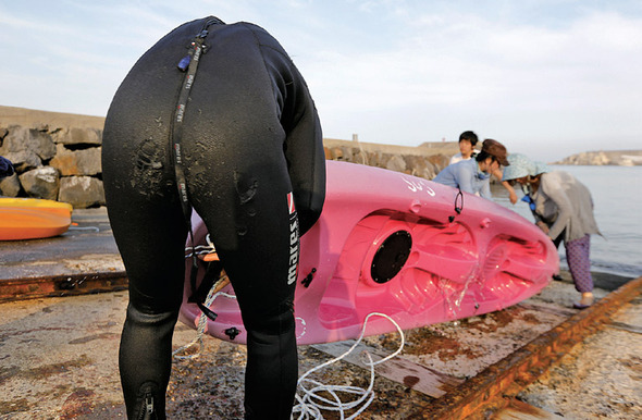 해상시위를 마친 뒤 카약을 정비하고 있다. 한 팀원의 슈트 엉덩이 부분이 오랜 활동으로 인해 구멍이 뚫려 있다.※ 이미지를 클릭하시면 좀더 큰 이미지를 보실 수 있습니다.