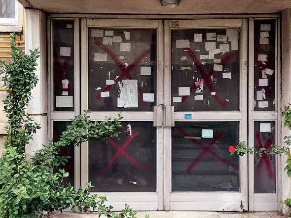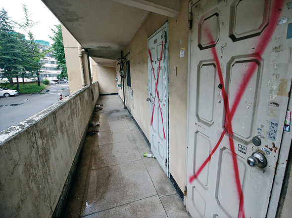 모두가 이사한 빈 동에는 ‘X’ 표시와 함께 철사로 출입문을 잠가놓았다.