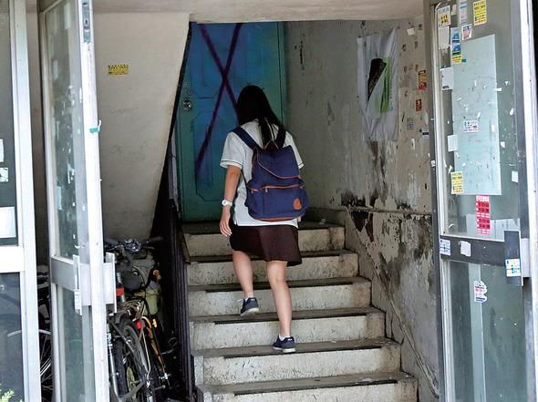 아파트에 살고 있는 학생이 집으로 들어가고 있다.