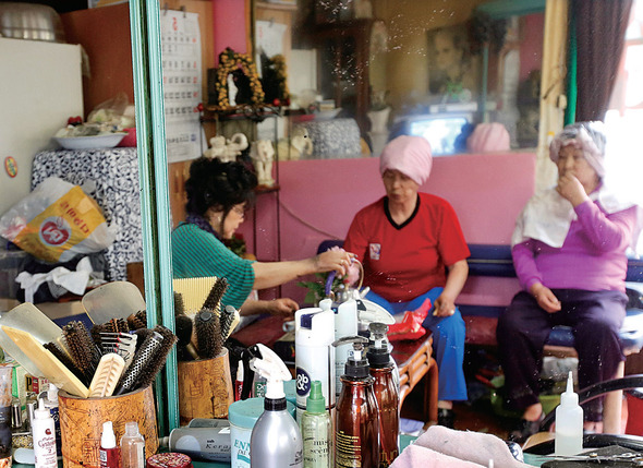 단지 안 미용실에 주민들이 모여 이야기를 나누고 있다.