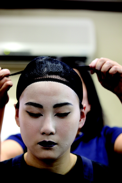 모델에게 가발을 씌우기 위해 머리에 망사 두건을 두르고 있다.