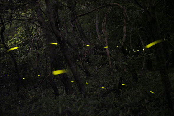 반딧불이가 숲 속에서 화려한 빛을 내며 구애를 하고 있다.