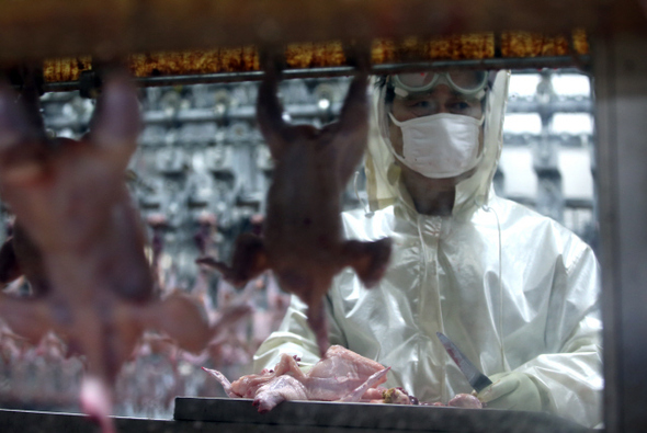 (주)하림 정읍공장에서 수의사가 도계된 닭고기를 식 품 위생과 안전을 위해 검사하고 있다.