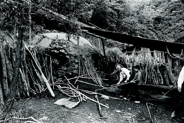 할머니와 아들, 손자 3대가 숯 굽는 일을 하고 있다. (1969년 5월·쓰시마섬)