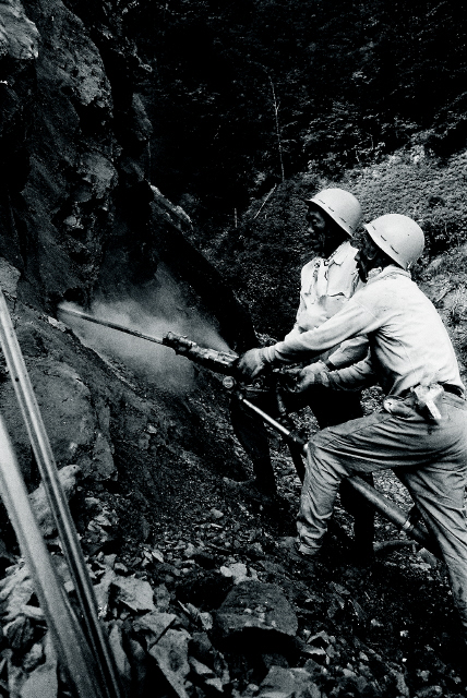 산에 임도를 내기 위해 암석을 깎아내는 인부들. (1967년 8월·사이타마현 지치부)