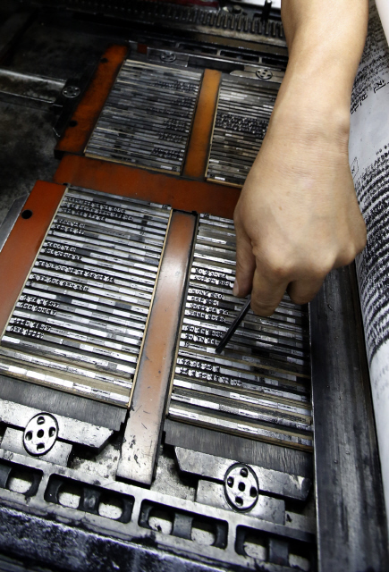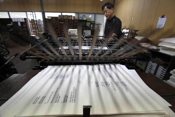 활판인쇄공인 김진수(59)씨가 한장 한장 종이를 맞춰 넣은 활판인쇄기에서 인쇄물이 나오고 있다.