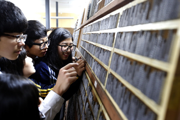 활판공방을 찾은 학생들이 수많은 활자 사이에서 자신의 이름을 찾고 있다.