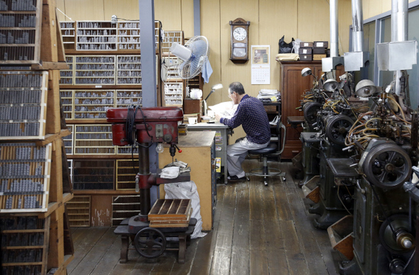 활자 주조공 정흥택(74)씨가 58년간 자기 자리를 지키고 있다.
