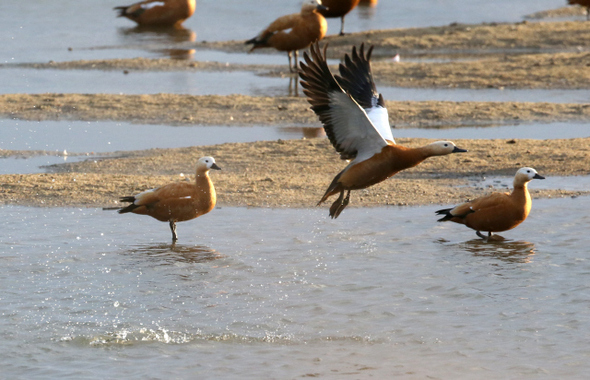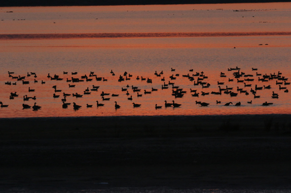 여명의 햇살을 받으며 천수만 간월호의 철새들이 수면 위에서 휴식을 취하고 있다.