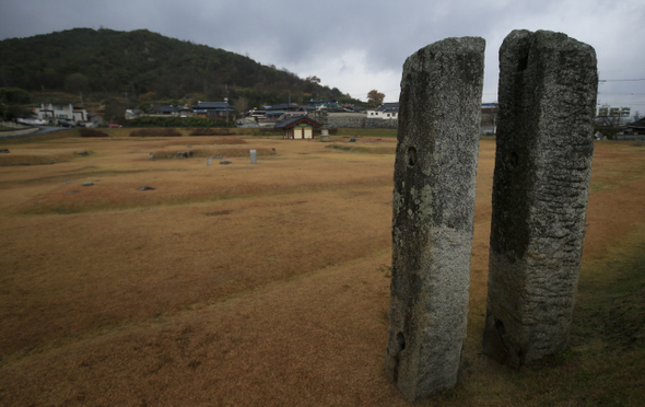 전북 남원시 왕정동에 있는 만복사 터가 보물 제32호인 당간지주 뒤로 펼쳐져 있다.