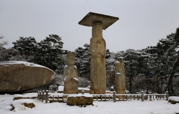 충청남도 문화재 자료 제373호로 지정된 통일신라시대의 석불입상이 하얗게 내리는 눈을 맞고 있다. 얼굴은 타원형으로 훼손이 심하나 인자한 모습이다.