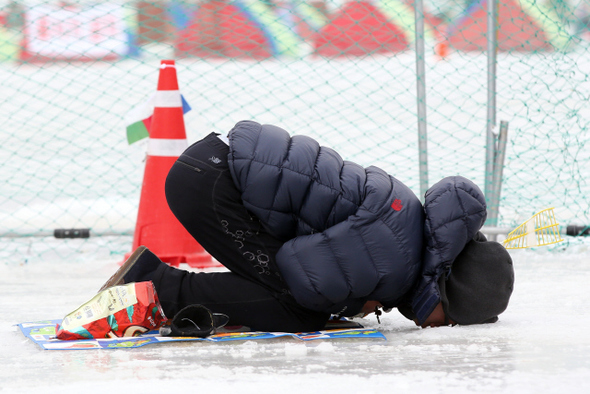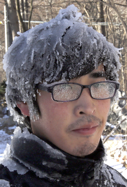 인공눈을 뿌리는 곳에서 작업하던 직원의 몸이 영하의 추운 날씨로 인해 꽁꽁 얼었다.