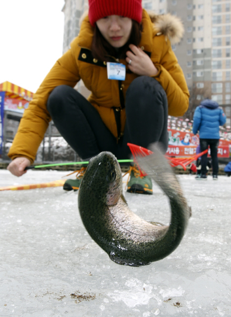 평창 송어축제를 찾은 관광객이 송어잡이를 위해 뚫어놓은 구멍으로 물속 풍경을 하염없이 보고 있다.