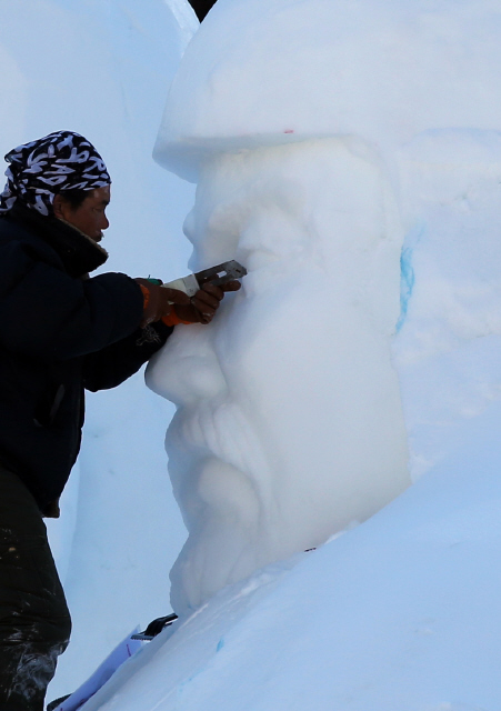 이순신 장군 눈 조각상을 만들며 눈꽃축제 준비가 한창이다.
