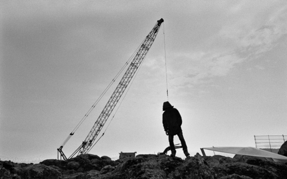 ① 제주 해군기지 공사의 불법성을 감시하는 평화활동가의 목 위로 대형 크레인 줄이 겹쳐지고 있다. 마치 국가폭력에 목 졸려 질식돼온 제주도의 과거와 오늘을 은유하는 듯하다.