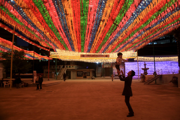 부처님 오신 날을 며칠 앞둔 4월30일 저녁 연등이 환하게 켜진 서울 종로구 조계사 대웅전 앞마당에서 젊은 아빠가 아이를 공중에 띄워주고 있다. 이 나이의 아이들에게 아빠는 세상에서 가장 힘세고 멋진 슈퍼맨이다. 탁기형 선임기자 khtak@hani.co.kr