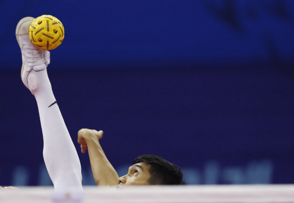 샴술 아크말(인도네시아)이 경기도 부천체육관에서 열린 남자 세팍타크로 경기에서 말레이시아 진영을 향해 매서운 공격을 하고 있다.