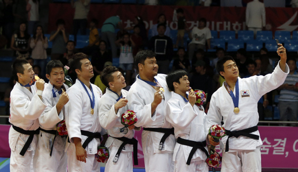 유도 단체전에서 금메달을 딴 한국 남자대표팀 선수들이 메달을 걸고 휴대전화로 셀프 기념사진을 찍고 있다.