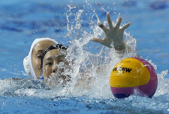 일본의 나카노 유미와 카자흐스탄의 나탈리야 알렉산드로바가 여자 수구 경기에서 공을 다투고 있다.