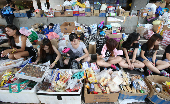 홍콩 도심 금융지역인 센트럴 도로에서 학생들이 시위에 참석한 시민들에게 물과 빵, 과자, 우산 등을 무료로 나눠주고 있다.