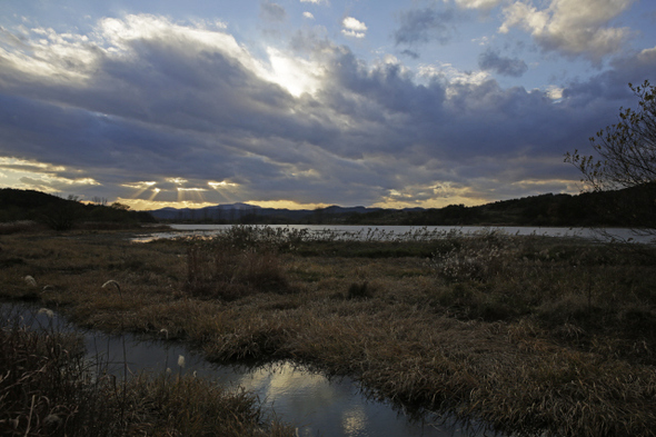 사지포(모래벌)의 일몰. 갈대와 줄풀이 가득한 물가 너머 구름 사이로 볕이 쏟아져내리고 있다.
