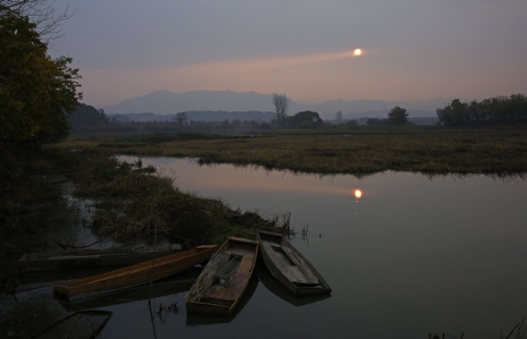 우포 소목 선착장의 늪배 너머로 두 개의 아침 해가 떴다. 늪배는 수심이 얕고 물풀이 많은 우포늪에 맞춰 밑이 넓고 가볍다.