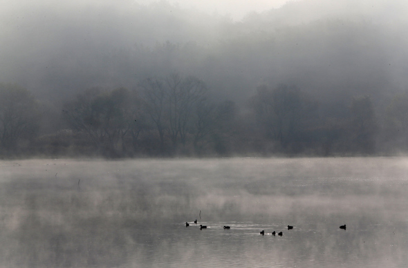 11월11일 새벽 물안개가 자욱하게 덮은 목포늪(나무벌). 물안개 사이로 쇠오리와 나무가 보이다 안 보이다를 반복한다.