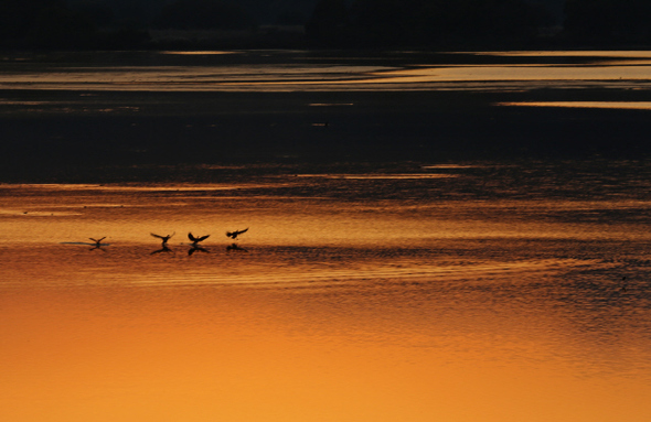 붉은 저녁놀이 물든 우포에 큰기러기들이 내려앉고 있다.